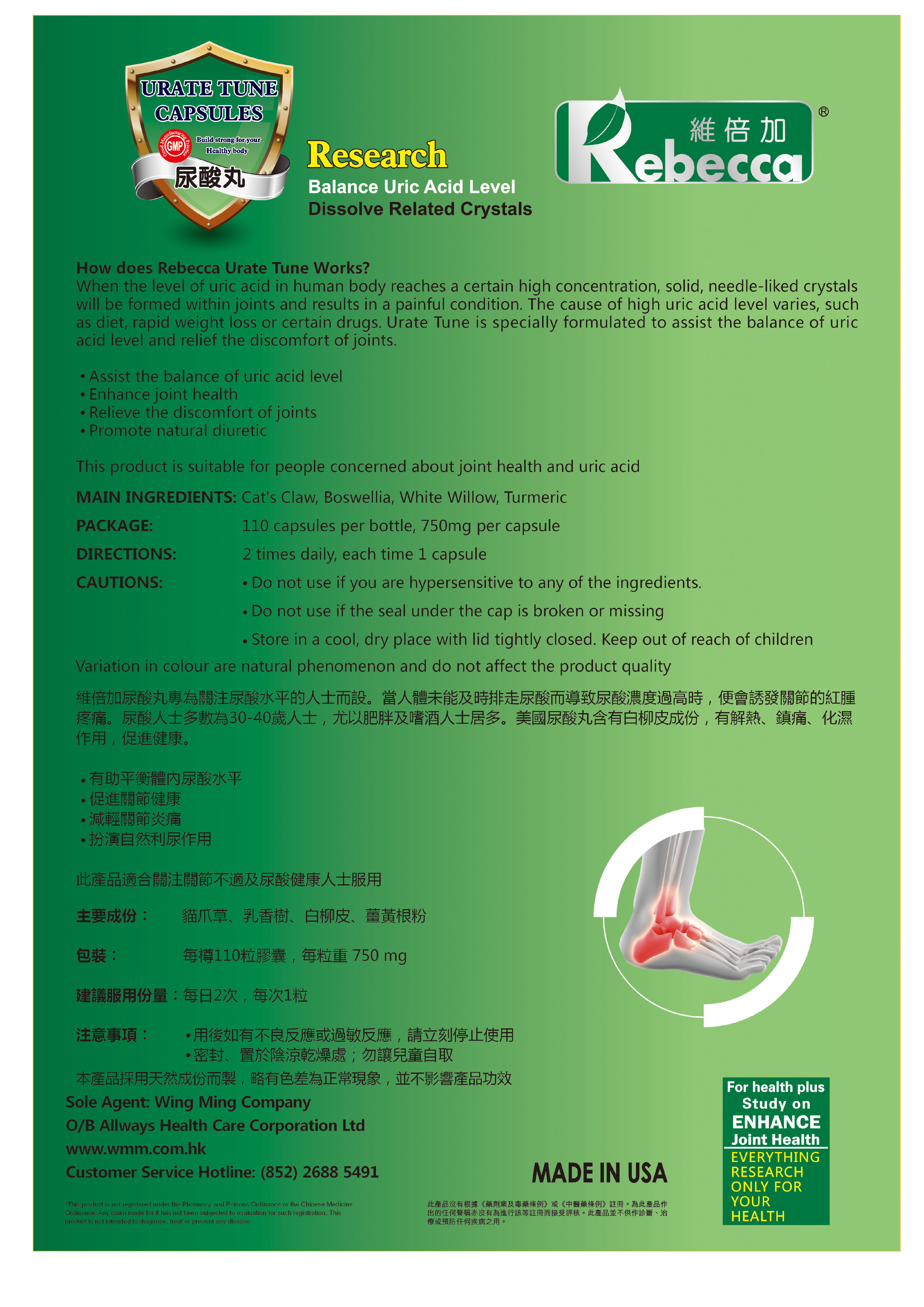 維倍加尿酸丸專為關注尿酸水平的人士而設。當人體未能及時排走尿酸而導緻尿酸濃度過高時,便會誘發關節的紅腫疼痛。尿酸人士多數為30-40歲人士,尤以肥胖及嗜酒人士居多。美國尿酸丸含有白柳皮成份,有解熱、鎮痛、化濕作用,促進健康。